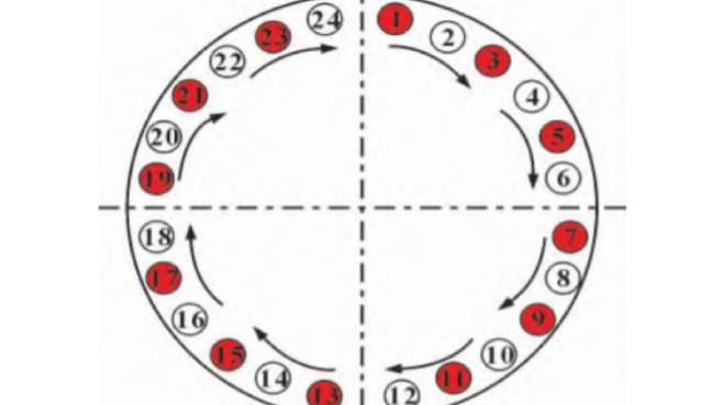 如上圖24路螺栓法蘭50%螺栓拉伸器覆蓋編號圖我們可以看出,螺栓依然是依次編號,只不過在安裝螺栓拉伸器時是總數(shù)分為兩組,隔一顆安裝,總體覆蓋便可以達(dá)到50%也就是12顆。安裝好之后按步驟拉伸即可。如此可知,24路螺栓法蘭25%的螺栓覆蓋需要做到6同步編號,也就是6組4個號,先均分為6個點標(biāo)“1”,再取間隔之中為“2”,依次取中編“3”,編“4”,編完即可。拉伸時按照編號分次拉伸。