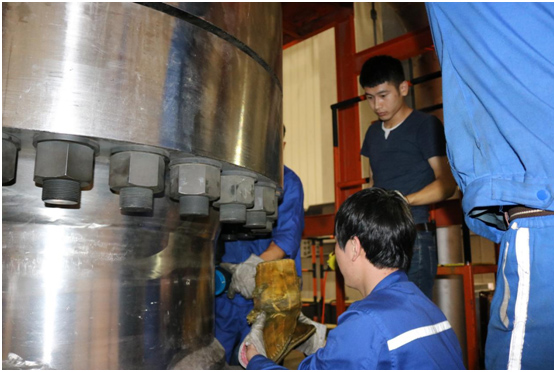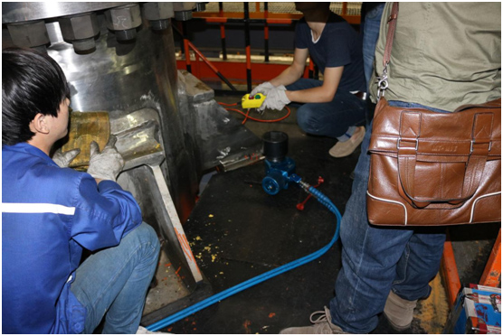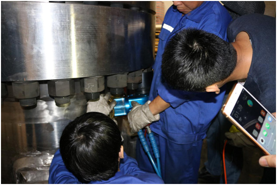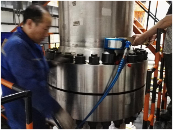現(xiàn)場工作人員非常認真地與波霆機械工程師進行交流、探討以及學習液壓扳手的正確操作方法。培訓剛剛結(jié)束大家就開始忙碌起來,對應兩個法蘭現(xiàn)場工人分成兩組,每組三個人,采用兩同步拆卸螺栓。