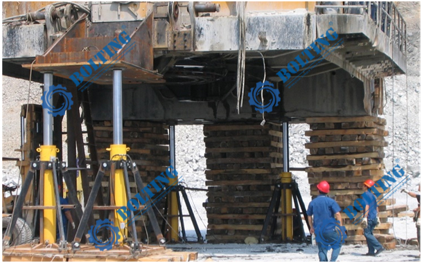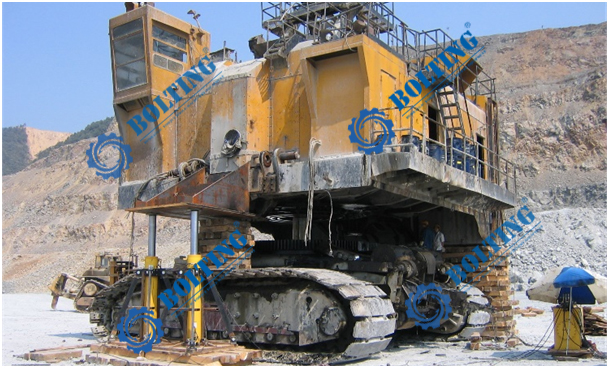 已知所需頂升設(shè)備為礦用電鏟,對(duì)電鏟進(jìn)行回轉(zhuǎn)支承維護(hù)等工作,總重量約為1000噸,需更換履帶行走裝置、回轉(zhuǎn)裝置等部件,就需要將整機(jī)同步頂升,平穩(wěn)的頂起到一定的高度,便于現(xiàn)場(chǎng)的檢修,頂升過程中需保證不損壞整機(jī)結(jié)構(gòu),也需使其均衡受力。