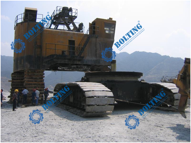 電鏟是千萬噸級(jí)露天礦山主要采掘設(shè)備之一,生產(chǎn)率高,作業(yè)率高,操作成本低,是目前采礦業(yè)公認(rèn)的機(jī)型。電鏟由行走裝置、回轉(zhuǎn)裝置、工作裝置、潤滑系統(tǒng)、供氣系統(tǒng)組成。鏟斗是電鏟的主要部件,它直接承受被挖掘礦石的作用力,因而磨損較大,斗桿也是電鏟挖掘過程中的主要部件之一,它的作用是連接和支持鏟斗,并將推壓作用傳送給鏟斗,鏟斗在推壓和提升力的共同作用下完成挖掘土壤的動(dòng)作;其行走機(jī)構(gòu)中最為核心的履帶裝置,經(jīng)過相關(guān)的傳動(dòng)機(jī)構(gòu)最終使其在地面直接移動(dòng)!