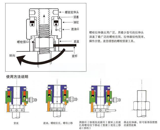 液壓螺栓拉伸器的工作原理可以簡單概括為:電動油泵輸出的高壓油通過高壓軟管輸送到液壓油缸。在高壓油的作用下,液壓缸產生拉伸力,并作用于被預緊的螺栓上。隨著活塞桿的繼續(xù)運動,螺栓被拉伸到一定長度,然后擰緊螺母,再松卸螺栓,完成螺栓的預緊工作。液壓螺栓拉伸器通過直接對螺栓施加軸向拉力,使螺母與法蘭面之間產生間隙,從而用較小的力將螺母旋緊。在釋放拉伸力時,雖然會有一定的載荷損失,但通過規(guī)范操作和經驗積累,可以很好地控制這種損失,確保預緊力的準確性。