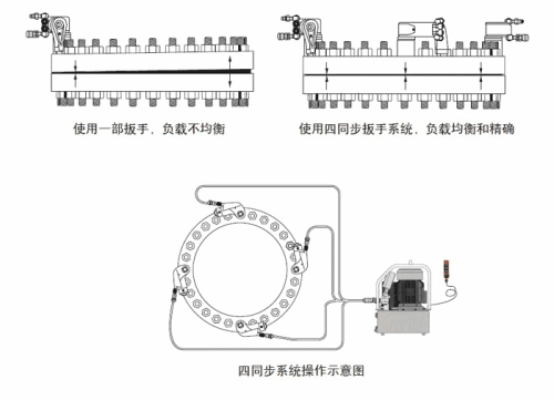 四同步系統(tǒng)的主要目的是為了避免法蘭面單邊受壓模式,這種模式會導致法蘭面的墊片因擠壓過度而失效,從而引起泄露。四同步系統(tǒng)是四部扳手同時接在一臺泵上使用。根據液壓原理,四部扳手同時工作,同時輸出設定扭矩,即可實現法蘭平行閉合,其扭矩精確度能達到±3%。四同步系統(tǒng)可一次將螺栓鎖緊,而單系統(tǒng)需要多次加載,分步鎖緊,因此四同步系統(tǒng)效率遠大于單系統(tǒng)的四倍。