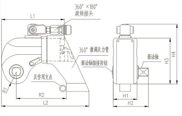 液壓扳手的工作頭主要由三部分組成,框架(也叫殼體),油缸和傳動部件。油缸輸出力,油缸活塞桿與傳動部分組成運(yùn)動副, 油缸中心到傳動部件中心這個距離是液壓扳手放大力臂,油缸出力乘以力臂,就是液壓扳手理論輸出扭矩, 由于摩擦阻力存在, 液壓扳手實際輸出扭矩要小于理論輸出扭矩。