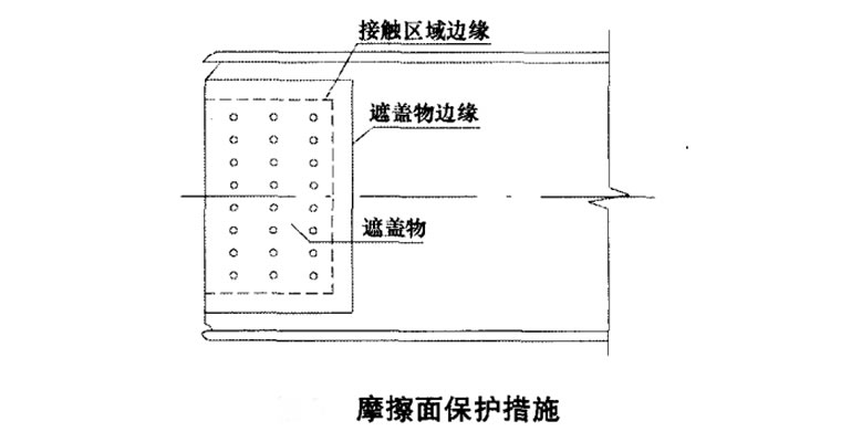 1、在對(duì)螺栓、連接板的運(yùn)輸和保存過程中,應(yīng)輕裝、輕卸,防止損傷螺紋和連接板 。此外還應(yīng)采取一定的防潮 、防銹 和防沾染贓物等相應(yīng)措施,保護(hù)摩擦面,對(duì)摩擦面已被污染的連接板等 , 應(yīng)進(jìn)行相應(yīng)的處理才能使用。圖是一種簡(jiǎn)便可行的保護(hù)摩擦面的方法。在防腐施工前,將紙張等遮蓋物,覆蓋在摩擦面之上,遮蓋物四邊要 寬于接觸區(qū)域邊緣,并且用膠帶將遮蓋物邊緣進(jìn)行粘貼密封 。