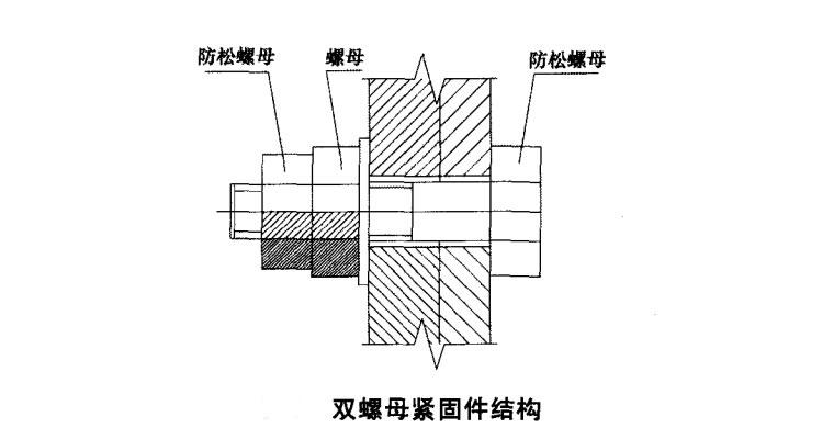 4、雙螺母連接也是目前廣泛采用的一種螺栓防松動(dòng)的方法。這種鎖緊裝置的工作原理是靠?jī)陕菽傅穆菁y產(chǎn)生的微小彈性變形而將螺母鎖緊,其具有更長(zhǎng)的抗振壽命。圖 5 是一種常見 的雙螺母緊固件,由防松螺母、螺母和防松螺栓組成。其中防松螺母和螺母旋擰方向相反,防松螺栓末端 由工作螺紋和防松螺紋兩段直徑不同的螺紋組成,防松螺紋外徑小于緊固螺紋內(nèi)徑。 緊固件在工作時(shí),螺母在振動(dòng)、沖擊等作用下,可能發(fā)生微小變形或松動(dòng),但由于兩螺母的旋擰方向相反,防松螺母此刻起到擰緊和阻止螺母松退 的鎖緊作用,從而確保工作螺母無法松脫。